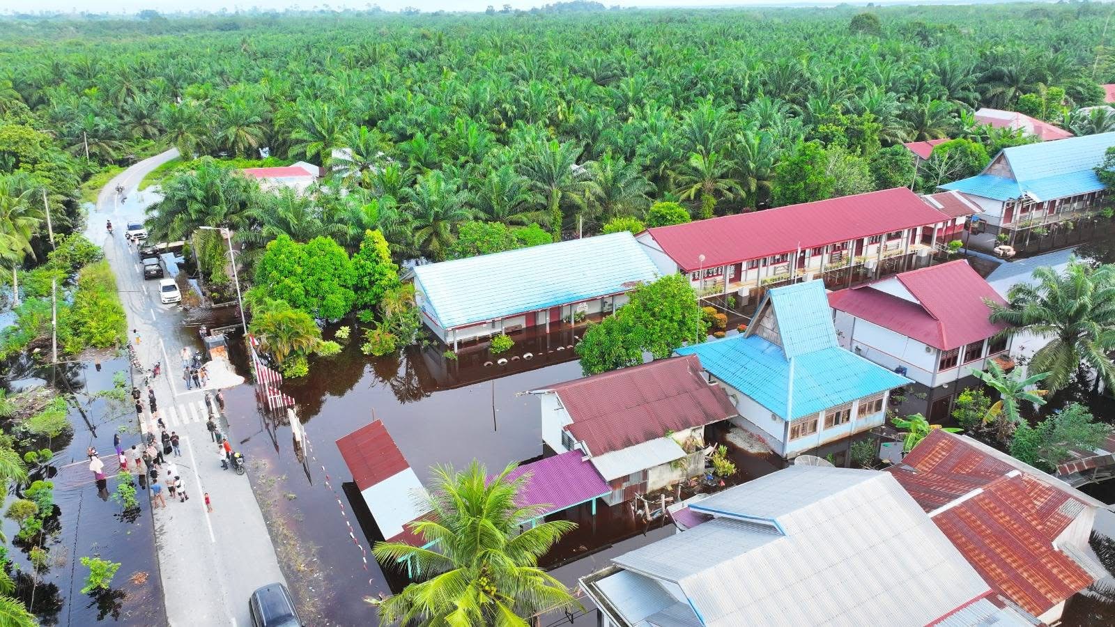 Genangan air setinggi lutut orang dewasa merendam permukiman warga di Jalan Duku, Kampung Mengkapan. Sedikitnya 15 rumah warga terdampak, termasuk fasilitas pendidikan SD Negeri 22 Kampung Mengkapan yang ikut tergenang.