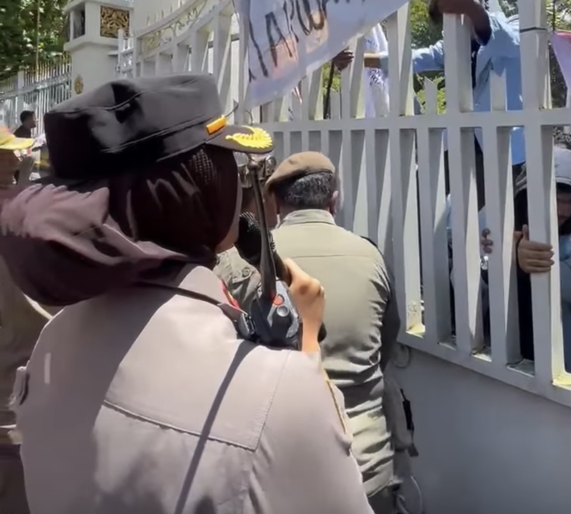 Sebagian pagar pembatas mengalami kerusakan, sementara gerbang utama nyaris terbuka akibat dorongan massa yang ingin bertemu langsung dengan gubernur.