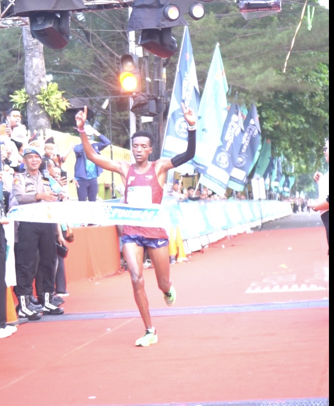Pria kelahiran Kenya itu menyelesaikan lomba dengan waktu 1 jam 5 menit 10 detik, mengalahkan ratusan peserta lainnya dan mengamankan posisi teratas di podium.