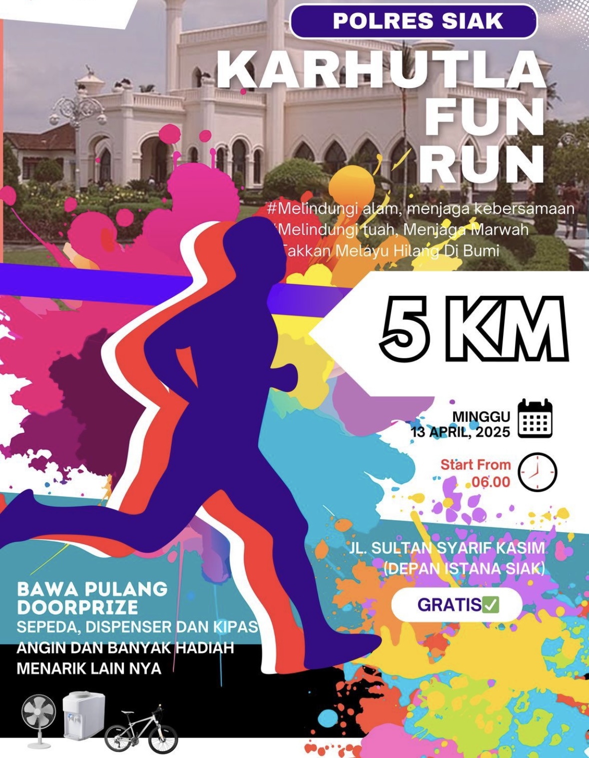 SIAK – Pecinta olahraga lari di Kabupaten Siak patut berbahagia. Pasalnya Karhutla Fun Run 2025akan digelar serentak di seluruh wilayah Riau, termasuk di Kabupaten Siak, Minggu, 13 April 2025.