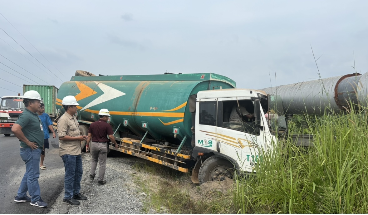 Satu unit truk tangki pengangkut Crude Palm Oil (CPO) dengan nomor polisi BK 9982 ER mengalami kerusakan di bagian roda depan hingga keluar jalur dan menabrak pipa minyak milik PT BOB.