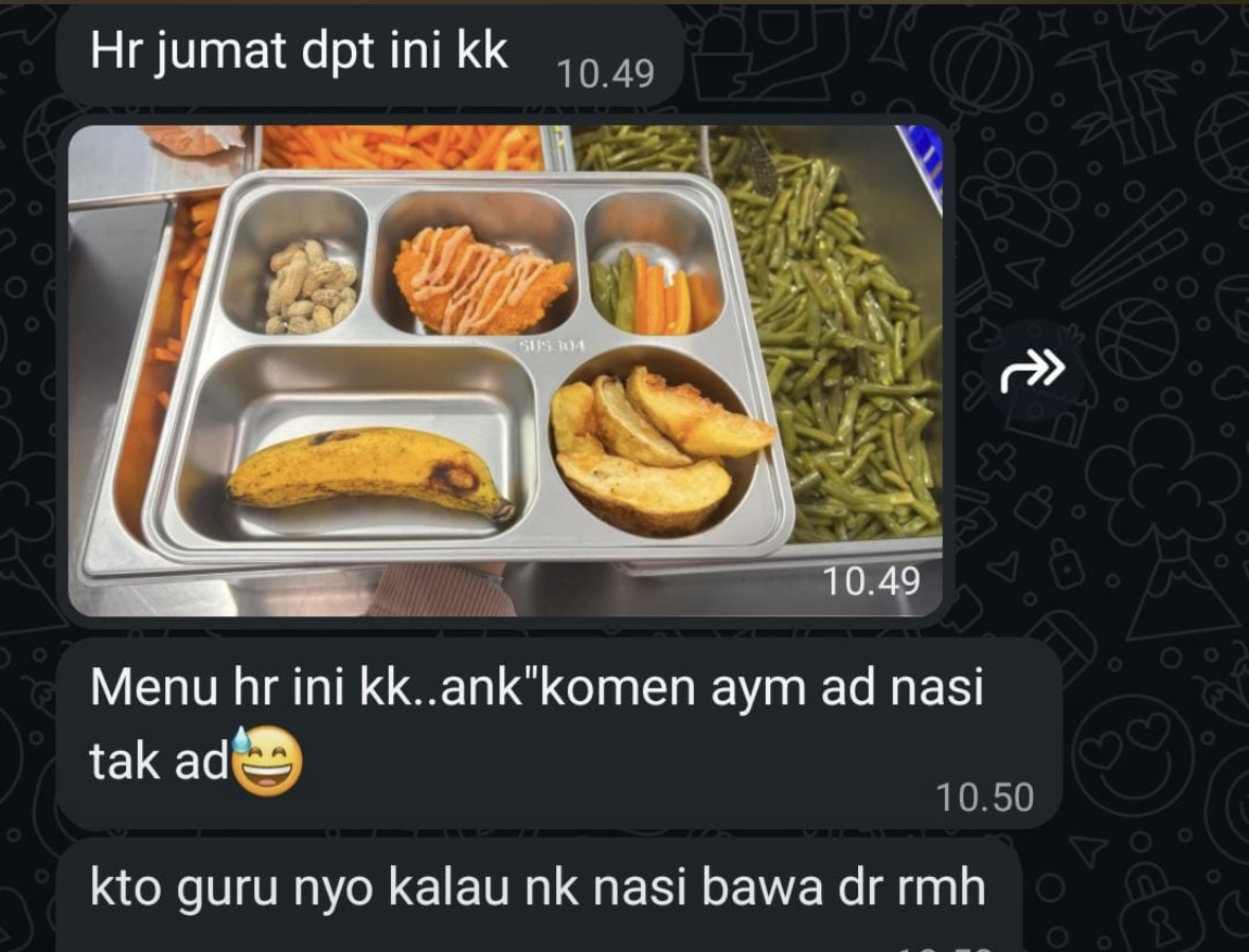 Komentar itu pun mendapat berbagai tanggapan, ada yang menilai lucu, namun tak sedikit pula yang menganggap penyajian menu tanpa nasi kurang tepat untuk kebutuhan gizi anak sekolah.