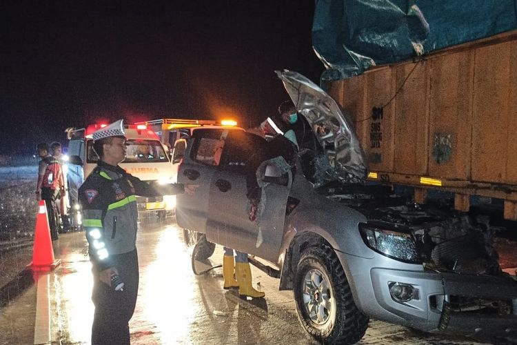 AKP Vino menjelaskan, kecelakaan terjadi saat mobil Ford mencoba mendahului dua truk di jalan tol yang tengah diguyur gerimis. Mobil tersebut kemudian berbelok secara mendadak dan menabrak truk fuso bermuatan pupuk kandang.