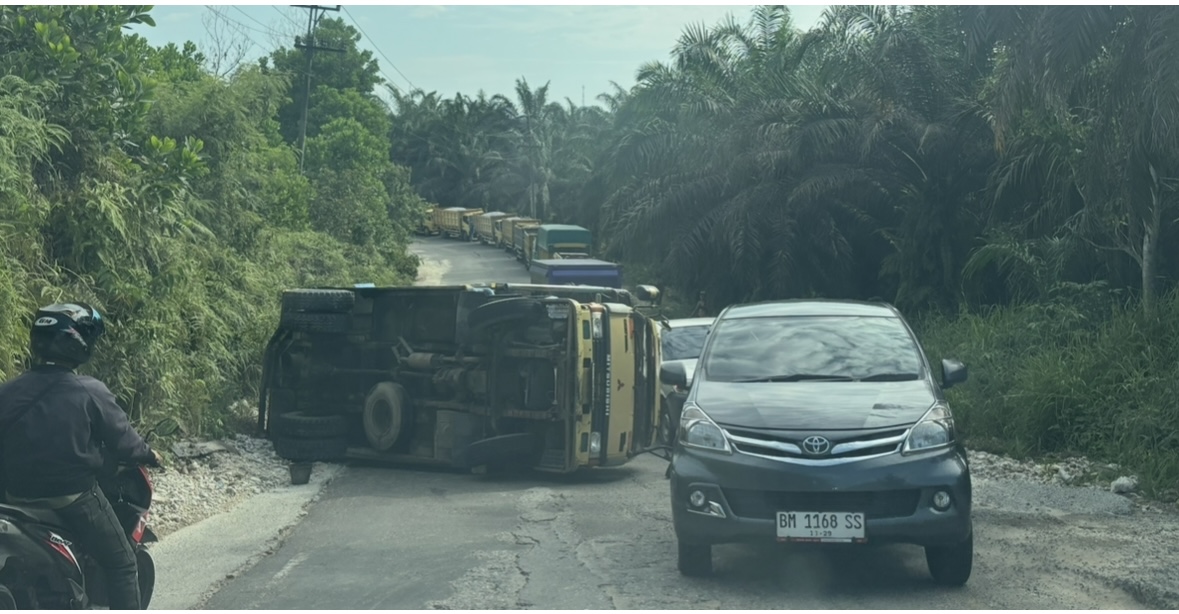 Satu unit truk Mitsubishi Canter berwarna kuning yang membawa muatan sembako tujuan Siak terguling setelah gagal menanjak di ruas jalan yang dikenal curam dan bergelombang.
