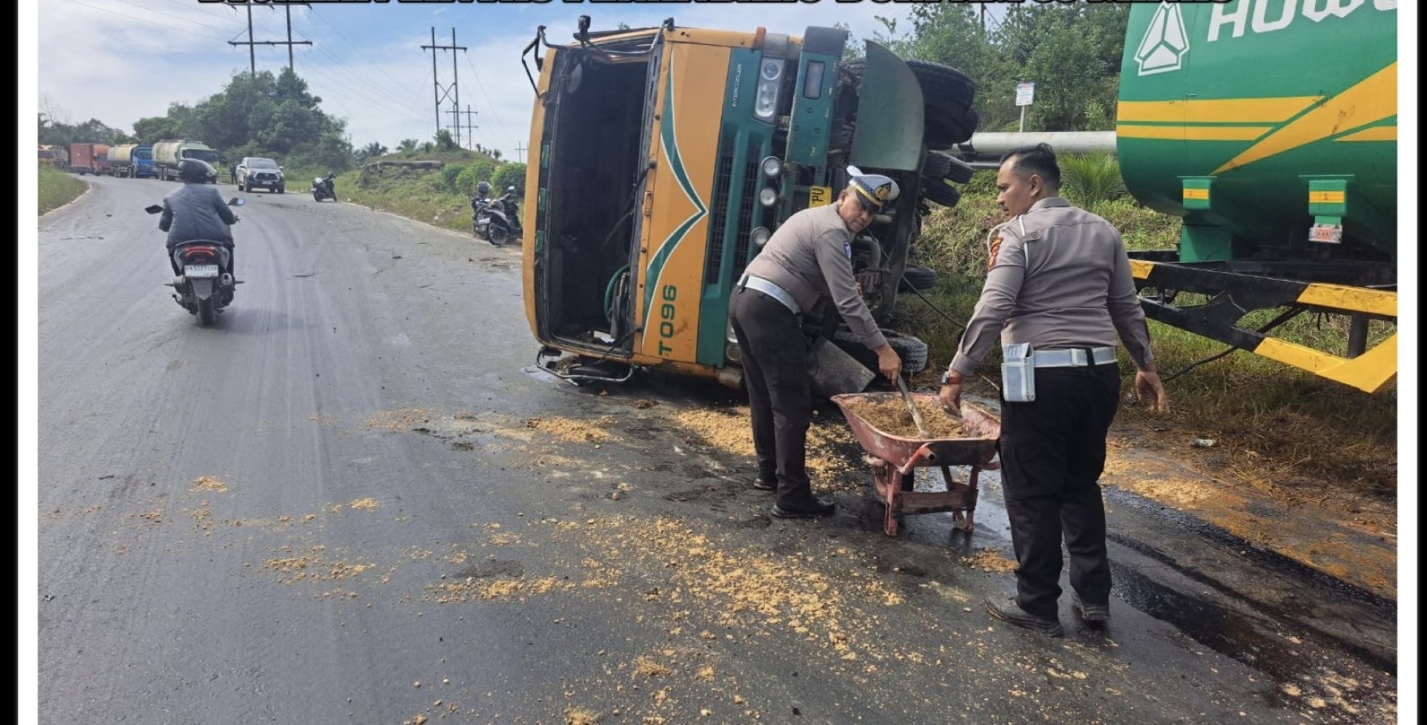 Peristiwa ini mengakibatkan tumpahan minyak sawit mentah di badan jalan dan menyebabkan kemacetan lalu lintas serta membahayakan pengendara yang melintas.