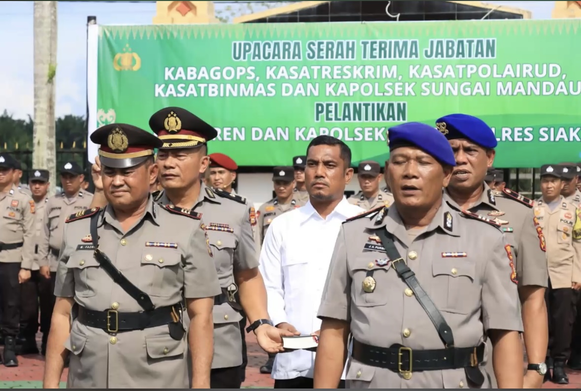 Kegiatan yang berlangsung di Mapolres Siak sore itu melibatkan serah terima jabatan Kabagops, Kasatreskrim, Kasatbinmas, Kasatpolairud, Kapolsek Sungai Mandau, serta pelantikan Kabagren dan Kapolsek Kandis.