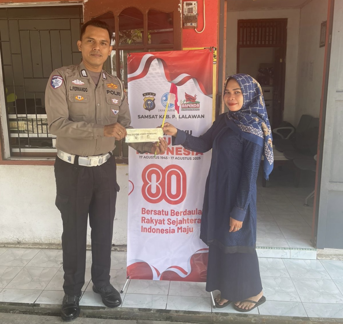Personel Sat Lantas Polres Pelalawan Memberikan Bendera Merah Putih Kepada Wajib Pajak